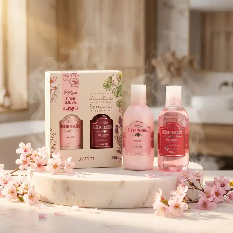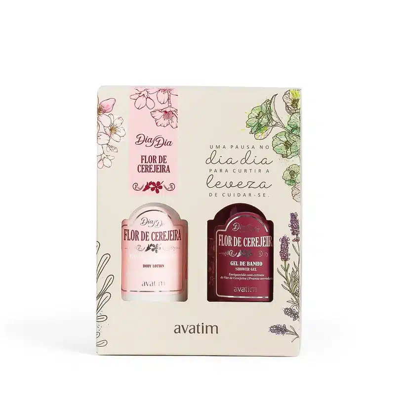 A rotina de banho completa com a delicadeza da Flor de Cerejeira — o Avatim Kit Dia Dia Flor de Cerejeira. Inclui a Emulsão Hidratante (200ml) com manteiga de cupuaçu e óleo de cereja e o Gel de Banho (200g) com extrato de flor de cerejeira — uma experiência floral e frutada do banho à hidratação.